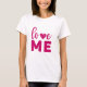 This design features the phrase “love ME” in a bold and expressive style. The word “love” is written in lowercase, while “ME” appears in bold uppercase letters, creating a strong visual contrast. The letter “o” in “love” is replaced by a pink heart filled with tiny heart shapes, adding a sweet and affectionate touch. The entire text is pink against a black background, giving the design a modern and striking appearance.
