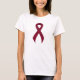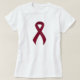 Ruban de Bourgogne avec "sensibilisation au soutien" écrit dessus. Le ruban bordeaux est associé au Mois de sensibilisation à la section césarienne en avril; au Mois de sensibilisation au syndrome d'anticorps anti-phospholipidique et au Mois de sensibilisation aux maux de tête en juin; au Mois de sensibilisation à la méningite et à la méningite méningococcique en août; au Mois de sensibilisation aux adhésions, au Mois de sensibilisation à l'athémie cérébrale et au virus de la drépandue; au poil o Mois de la sensibilisation au syndrome en octobre; Mois de la sensibilisation aux soins d’accueil en novembre. Et la sensibilisation à la malformation AV, à l'hygrome kystique, à la malformation des adultes handicapés, au facteur V, à la malformation hémogène et vasculaire, à l'hémochromatose héréditaire, au syndrome de Hughes, à la malformation lymphatique, au myélome multiple, aux PHACES, au syndrome de Weber-Étouffes, à la thrombophilie et au syndrome de William.
