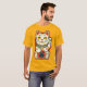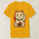 Cette illustration éclatante présente un Maneki Neko japonais traditionnel, ou "Chat chanceux", représenté dans un style charmant et fantaisiste. Le chat est montré assis debout, soulevant sa patte gauche dans un geste d'accueil qui est censé apporter la chance et le bonheur. Le chat a une expression délicieuse et joyeuse, avec ses yeux larges et sa bouche courbée dans un sourire doux. Le Maneki Neko est principalement blanc avec des taches de jaune et de rouge, ajoutant une touche de gaieté et de coloris au design. Il porte un collier vert orné d'une cloche en or, symbolisant richesse et prospérité. Le chat tient une grande pièce rouge avec des empreintes de pattes noirs, en soulignant son rôle de porte-bonheur et de bonne fortune. L'arrière - plan présente un cercle rouge audacieux, rehaussant l'apparence brillante et joyeuse du chat. Le design d'ensemble a une texture rétro, légèrement en détresse, lui donnant une sensation nostalgique et intemporelle.