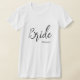 Le t-shirt pour femmes est présenté dans un style à col rond et manches courtes en blanc avec du texte noir : Mariée et un nom d'échantillon personnalisé.