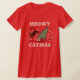 Illustration de style rétro avec design de texte "Meowy Catmas" et chat noir mignon, arbre de Noël, flocons de neige, cadeaux, pattes et étoiles décoration