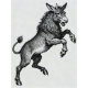 Valefor, a fierce Ars Goetia spirit, as a lion-bodied, donkey-headed entity mid-lunge, radiating wild power and cunning energy in a bold monochrome fantasy vision. Dark fantasy ink illustration, high contrast, dramatic, gothic occult style.