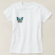 This playful and edgy artwork features a bright blue butterfly with vibrant, gradient wings fading from blue to green, yellow, and pink. Despite its adorable appearance—complete with heart-tipped antennae and large, sparkling eyes filled with star-shaped glints—the character is gripping a large silver kitchen knife with a determined grip. The design contrasts the innocent, colorful beauty of a butterfly with a humorous touch of danger, all rendered in a clean, bold cartoon style.