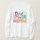 Le design du t-shirt comporte le texte "Rise Above Inspire." en plusieurs couleurs, avec une police audacieuse et dynamique. Les couleurs sont vives et attrayantes, et le texte est arrangé de manière créative et engageante. Le design est parfait pour toute personne qui veut express leur perspective positive et inspirer les autres.