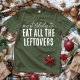 Celebrate the best part of the holidays with this witty and relatable custom Christmas t-shirt design that perfectly captures the post-dinner goal, "Most likely to eat all the leftovers"! The bold, distressed white lettering stands out sharply against the deep green background, ensuring the humorous message is easily read. Using mixed fonts for emphasis, this design creates a fun, casual, and highly memorable statement for your family's coordinated holiday festivities.