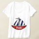 Ce T-shirt mignon et à la mode de voilier a les voiles rayées bleues et blanches sur un bateau rouge. Ajoutez un nom ou un texte si désiré.
