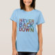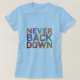 Le design du t-shirt comporte le texte "Never Back Down" dans un design audacieux et multicolore. Chaque mot pourrait être d'une couleur différente, créant un affichage dynamique et attrayant de la résilience. La police elle-même peut être forte et légèrement angulaire, mettant l'accent sur l'esprit déterminé du message. N'oubliez pas qu'il n'y a pas de personnes incluses dans ce design.
