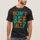 Ce t-shirt noir présente l'expression "NE PAS BEE SILLY" dans un design audacieux et empilé utilisant des lettres turquoises et orange. Des lignes diagonales coupées dans le texte, ajoutant une sensation dynamique et légèrement pointue au message ludique.