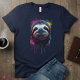 A bold, colorful sloth portrait with vibrant brush splashes — statement tee for artistic wardrobes and creative gifts.