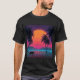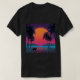 A sleek black cat strolls across a glowing turquoise grid, framed by tall palm trees and a blazing orange sunset over distant mountains. The starry violet sky and retro lines give this scene a dreamy synthwave mood. Perfect for cat lovers who enjoy bold neon colors and nostalgic 80s vibes.