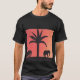 Ce T-shirt noir est conçu avec ma représentation de deux éléphants, et une silhouette de palmier contre un coucher de soleil orange.