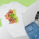 Un t-shirt avec la citation, Chaque jour est une nouvelle aventure, accompagné d'une flèche d'encre, dressé contre un arrière - plan d'aquarelle à deux tons dans des tons rafraîchissants de vert et d'orange vivifiant crée un cadre dynamique pour l'autonomisation.