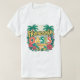 Le design des t-shirts comporte l'expression "Oasis de l'amitié" en caractères gras et colorés. Elle est entourée d'éléments tropicaux comme des palmiers, des fleurs et un paysage désertique sablonneux. L'ensemble est chaleureux, amical et une atmosphère relaxante et accueillante.