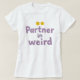 The image features the phrase "Partner in Weird" written in a playful, light purple font against a black background. The word "Partner" is emphasized with a bright yellow square and circle above it, drawing attention to the concept of partnership. The design conveys a sense of humor and camaraderie, suggesting that the individuals involved share a unique bond characterized by their quirky and unconventional nature. This message celebrates the idea of having a close friend or partner who embraces and appreciates one's individuality, even when it's unconventional.