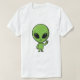 A cute green alien stands cheerfully against a deep black background, flashing a friendly peace sign. Its oversized head, smooth round shape, and large glossy black eyes give it a playful, approachable personality. Subtle highlights and clean outlines create a polished cartoon look, while the simple pose and bright green color make the character feel lighthearted and fun. The overall illustration blends sci‑fi charm with adorable kawaii style.
