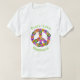 Ce t-shirt présente un signe de paix fleuri dans les tons rose, jaune, orange, violet, vert, blanc, noir et turquoise. "Paix, amour et bonheur" entourent le signe de paix.