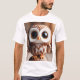 A small, stylized owl pauses on a wooden perch, its oversized glossy eyes rimmed in warm orange drawing you in. Rendered with loving feather detail and a cozy warm palette, this piece blends photoreal texture with a playful, endearing charm — perfect for prints, nursery decor, or collectors of whimsical wildlife art.
