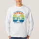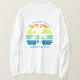 Ces t-shirts à manches longues et personnalisés cool de plage tropicale arborent 3 palmiers silhoués contre un ciel orange et bleu agrémenté de jaune et vert sur la côte. Customisez pour un séjour en famille de tee - shirts pour votre escapade sur la côte ce printemps, vacances d'été ou de croisière sur l'océan.