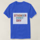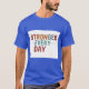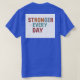 Le design des t-shirts présente un design audacieux et minimaliste avec l'expression "Stronger Every Day" imprimée dans une grande police sans-serif. Le texte est centré sur la chemise, avec un effet de flou subtil créant un arrière - plan dynamique. L'esthétique générale est propre et moderne, avec un ton motivant.