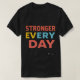 Un design de t-shirt dynamique avec l'expression "Stronger Every Day" en typographie multicolore et audacieuse. Le texte est agencé dans une disposition dynamique et attrayante, chaque lettre rayonnant une teinte différente et énergique. La conception d'ensemble traduit un sentiment de force, de résilience et de croissance positive.