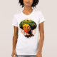 My Design présente un portrait stylisé d'une belle femme africaine portant un foulard coloré. L'écharpe est ornée de motifs de feuilles vertes et jaunes. Son visage est rempli d'une silhouette couché de soleil, avec des oiseaux volant à travers le ciel et un paysage arboré. Elle porte de grandes boucles d'oreilles ornées et un collier perlé. Illustration vectorielle de style pop art original Copyright BluedarkArt TheChameleonArt.