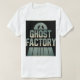 Une affiche d'inspiration vintage pour 'Ghost Factory' avec des bords décolorés et une figure fantomatique dans l'arrière - plan. Les lettres obscures et les couleurs muettes de noir, gris et blanc évoquent une esthétique mystérieuse et ancienne.