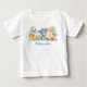 Chemise bébé Animaux Bébés Safari Aquarelle. Les animaux bébés comprennent Éléphant, Singe, Girafe, Rhinocéros, Zèbre et Lion sur des feuilles de fougère. Feuillage botanique aquarelle. Texte bleu. Ajouter un nom.