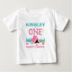 T-shirt anniversaire un an fille coloré avec thème camping avec un grand mot multicolore, tente rose, feu de camp, panneau et plus encore. Idéal pour une fête d'anniversaire un an sur le thème du camping pour une petite fille.