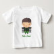 Un petit tee-shirt avec le dessin d'un garçon mignon en costume d'araignée avec des membres attachés à sa tenue et contrôlés par ses bras. Une paire de bretelles vertes se tient sur son pantalon. Il a une petite décoration de web sur ses cheveux. Un vêtement d'Halloween amical et adorable pour les bébés et les tout-petits pour aller à la ruse ou à la gâterie. Texte "Trick or Treat!" que vous pouvez personnaliser avec votre message ou le nom de votre enfant.