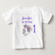 T-shirt pour le 1er anniversaire de bébé avec une illustration aquarelle élégante représentant une maman et un bébé licorne aquarelle avec crinière et toupet violets. De délicates fleurs orange entourent le duo.