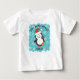 Le thème de l'animal arctique T-Shirt de Noël pour bébé présente un manchot mignon et joyeux qui danse avec un chapeau de Père Noël sur fond de flocons de neige hivernaux. Personnalisez le message de Noël (illustré ici avec Joie au Monde) et le nom du bébé pour un cadeau unique. Parfait pour un garçon ou une fille. Œuvre originale KL Stock.