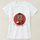 T-shirt féminin avec l'illustration d'un joli bébé noir souriant, joyeux, fille ou garçon, le bébé porte des vêtements rouges et blancs et tient un cadeau; avec texte modifiable modèle pour votre nom ou message, Noël vacances design