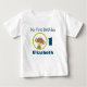 Un mignon t-shirt bébé qui dit : "Mon premier anniversaire" Personnalisez avec le nom. Un mignon petit singe safari tenant une suce dans la bouche à l'intérieur d'un cercle avec une bordure verte d'olivier.