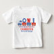 T-shirt de bébé pour le premier anniversaire de garçon avec un thème de train rouge et bleu, comportant du texte coloré, un train et de grandes lettres qui forment le mot "un".