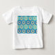 Ce t-shirt bébé a un design géométrique d'hexagones dans quatre tons de bleu sur un champ de rayures bronzées dans deux tons.