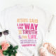 T-shirt chrétien avec le verset biblique de Jean 14:6 Jésus lui dit: "Je suis le chemin, la vérité et la vie. Nul ne vient au Père que par moi". Les versets sont en rouge orangé et rose et en calligraphie mixte et typographie minimaliste. Ce design de foi tendance et moderne est le cadeau idéal et une déclaration de mode. #chretien #religion #ecriture #foi #bible #jesus