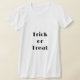 Ce t-shirt féminin est montré en blanc avec le texte : Halloween Trick ou Treat. Customisez cet objet ou achetez tel quel.