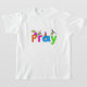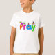 L'illustration mignonne de bande dessinée petits des garçons heureux et divers et les filles s'élevant au-dessus des lettres géantes de l'alphabet qui définissent le mot PRIENT. Image disponible sur de divers cadeaux et produits. T-shirts. Sweat - shirts à capuche.