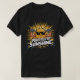 Powered by Sunshine - Eco-Friendly Tee Un soleil de dessin animé dynamique portant des lunettes de soleil et des bras de panneau solaire fléchissants avec des boulons de foudre derrière lui. Un texte audacieux, de style comique dit : "Powered by Sunshine". Palette lumineuse et énergique : jaune, orange et bleu électrique sur un arrière - plan en bruyère foncée. Appelle les acheteurs éco-conscients, les travailleurs de l'industrie solaire et les fans de durabilité.