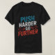 Ce t-shirt noir présente le texte de motivation "PUSH HARDER GO FURTHER" empilé verticalement dans une police audacieuse, légèrement en détresse, avec des couleurs bleues, blanches et rouges. Les éléments graphiques d'une cloche et d'une cloche sont intégrés au mot "GO", renforçant visuellement le thème de l'entraînement. La conception encourage un effort accru et des progrès dans la condition physique.