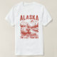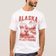 Ce t-shirt blanc présente un croquis rouge monochromatique illustrant une mère grizzli et son bébé assis au bord d'une rivière sur une scène sauvage de l'Alaska. Montagnes, arbres, couché ou soleil levant sont représentés dans l'arrière - plan. Le mot "ALASKA" est imprimé en gras rouge en haut, et "LE DERNIER FRONTIER" en petites lettres rouges en bas.