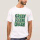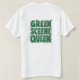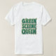 Le t-shirt "Green Scene Queen" présente un motif abstrait dynamique dans les tons vert, jaune et bleu. Le texte "Green Scene Queen" est affiché dans un style ludique et artistique, chaque lettre ayant sa forme et sa couleur uniques. Le design intègre des éléments de la nature, tels que des feuilles stylisés, des fleurs et des vignes, créant une esthétique visuellement attrayante et écologique.