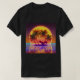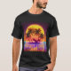 A curious squirrel silhouette poses on a tiny palm tree island against a gigantic glowing sun. The mirrored neon water and bright cyan grid reflections create a bold retro sci-fi atmosphere. Ideal for anyone who loves quirky animals, tropical settings and vibrant vaporwave color palettes.
