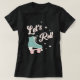 Un joli t-shirt d'anniversaire pour le patinage à rouleaux avec "Let's Roll" dans un script amusant style 70's et une illustration d'inspiration rétro d'un patinage à rouleaux bleu turquoise et rose vif.