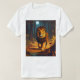 Un lion puissant se dresse fièrement, portant un T-shirt élégant qui contraste avec sa crinière majestueuse. Le T-shirt est bien ajusté, avec un design audacieux qui complète l'aura royale du lion. La fourrure dorée du lion et sa crinière épaisse encadrent la chemise, soulignant son comportement féroce mais décontracté. Ses yeux sont pointus et concentrés, dégageant confiance, tandis que la tenue décontractée ajoute une touche ludique à sa présence formidable. La scène saisit l'essence de la force combinée à une touche de mode moderne et cool.