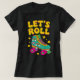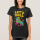 Ce t-shirt noir présente un dessin animé d'un patin à roulettes rose et un corps turquoise décoré d'arcs-en-ciel, de coeurs et d'étoiles. Le texte "LET'S ROLL" est imprimé au-dessus du patinage dans une police jaune ludique. Le design a une ambiance rétro, amusante et énergique.
