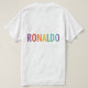Fanfare Bold : Ce t-shirt affiche fièrement le nom "Ronaldo" dans un schéma multicolore vibrant. Les lettres peuvent être un arc-en-ciel de teintes audacieuses, ou utiliser des combinaisons de couleurs contrastées pour un effet dynamique. Peut-être le design intègre-t-il des éléments graphiques comme des balles de football, des bandes, ou un numéro stylisé 7 (communément associé à Ronaldo) pour référencer subtilement son sport. Ce design est un moyen parfait pour les fans de montrer leur soutien au footballeur légendaire.
