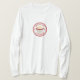 Un T-shirt comportant une illustration d'un petit gâteau rouge de velours avec le glaçage blanc à l'intérieur d'un cercle rouge et blanc décoratif avec le texte rouge.