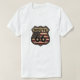 Classic Route 66 shield design featuring a weathered American flag background. Symbolizes freedom, travel, and the spirit of the open road across the United States.
