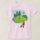 Santa Claus playing golf with his white and red outfit and a large big nose. With a five wood and a green 9th hole behind him